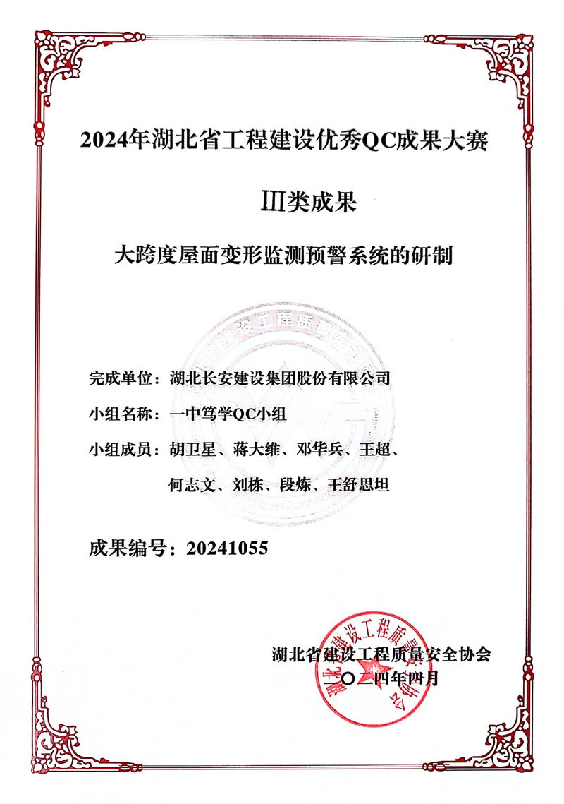 英山一中篤學(xué)QC小組《大跨度屋面變形監(jiān)測預(yù)警系統(tǒng)的研制》、順鮮項目QC小組《研究一種新型地下水防滲施工方法》獲評2024年湖北省工程建設(shè)優(yōu)秀QC成果大賽Ⅲ類成果