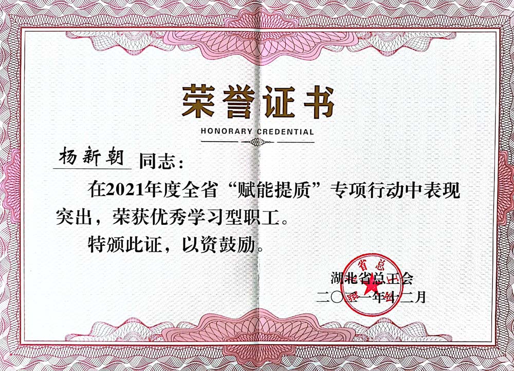 楊新朝榮獲2021年度湖北省賦能提質(zhì)優(yōu)秀學(xué)習(xí)型職工稱號