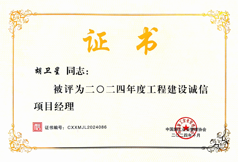 集團公司項目經(jīng)理胡衛(wèi)星獲評二○二四年度工程建設(shè)誠信項目經(jīng)理榮譽稱號