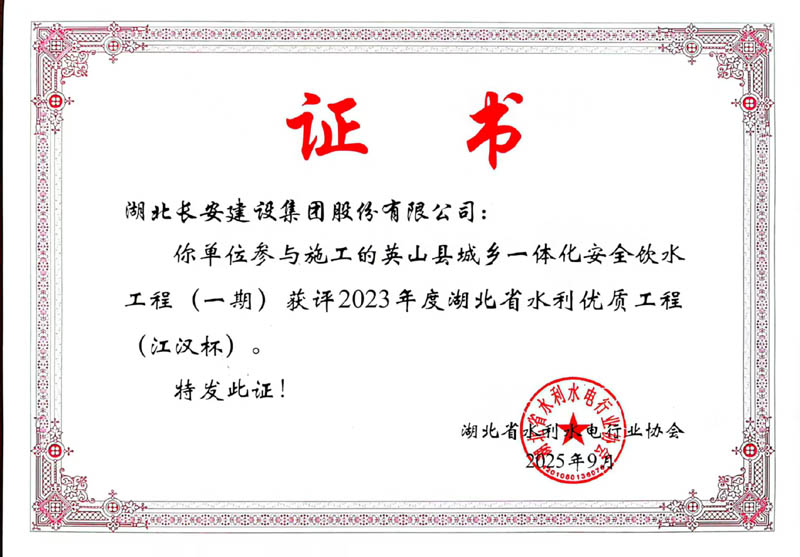 英山縣城鄉(xiāng)一體化安全飲水工程(一期)獲評2023年度湖北省水利優(yōu)質(zhì)工程(江漢杯)